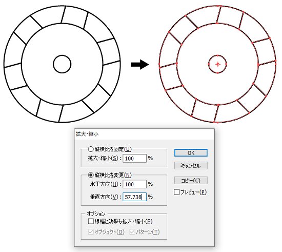 全体を選択して45°回転、拡大・縮小で水平方向100%、垂直方向57.738%にします。