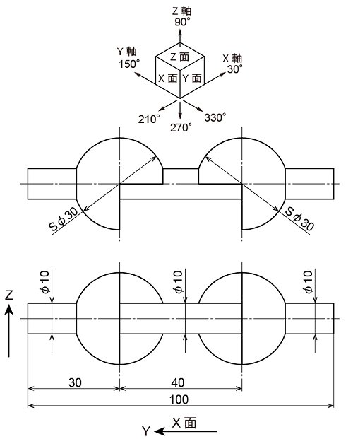 半断面の書き方と、貫いた丸棒との境界線が球の表面のどの位置に現れるかが考えさせられる所でしょうか。