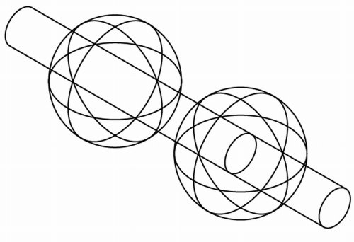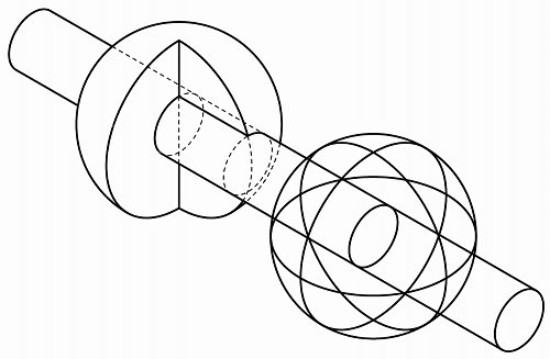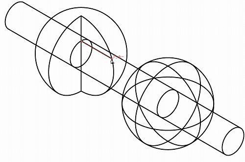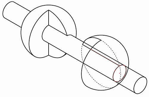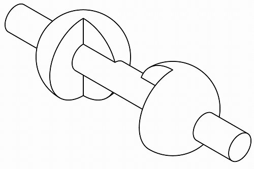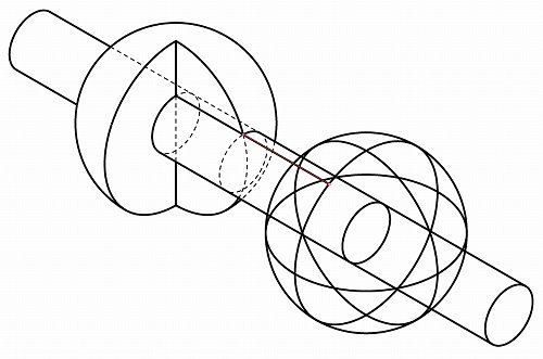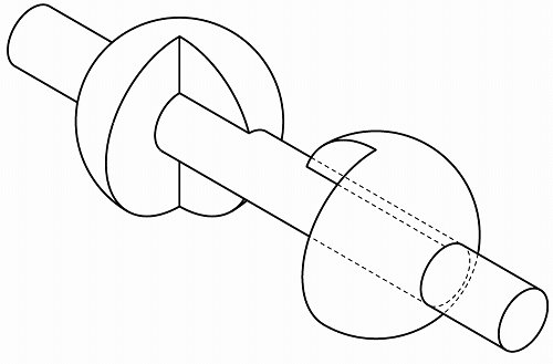 2つの同じ大きさの半断面の球が向き合っている状態を、直径10mmの丸棒が貫いている形状です。
