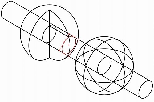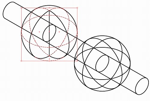 その交点に楕円をコピーします。ここが楕円と球の交わる位置です。