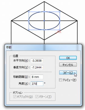 移動のボックスで、移動距離8mm、角度270°と入力し、コピーをクリックします。