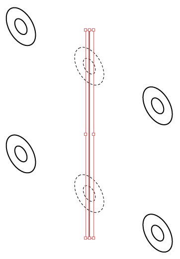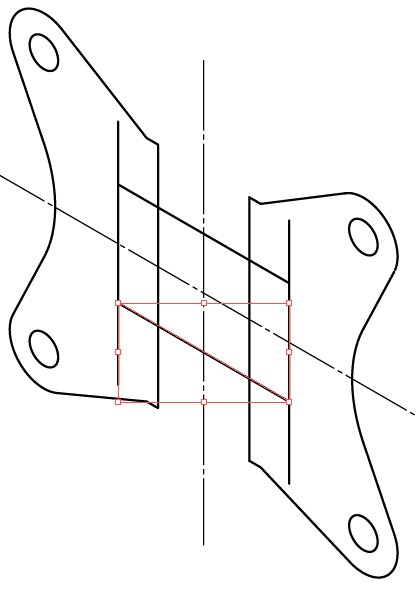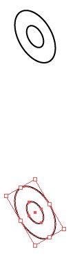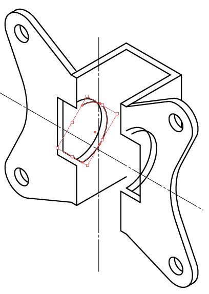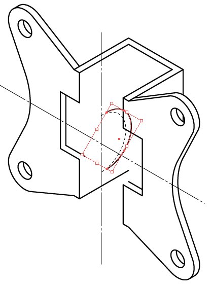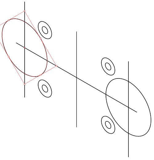 上部の2楕円間に直線を引き、22.5mm/270°に移動して少し拡大します。