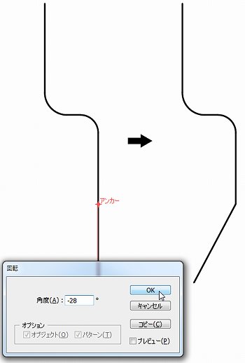 下の20mm直線を選択後、Rキーを押し、Altキーを押しながら下の20mm直線の上のアンカーをクリック。