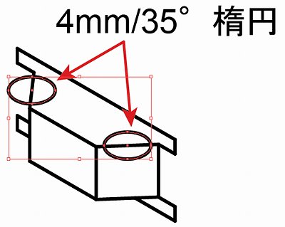 このような場合は、4mm楕円を作って斜めの線上に配置し、接線で厚みを出します。