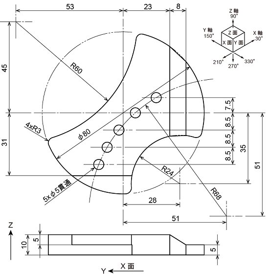 まず、最大のφ80楕円を書き、X・Y軸方向の中心線を引きます。