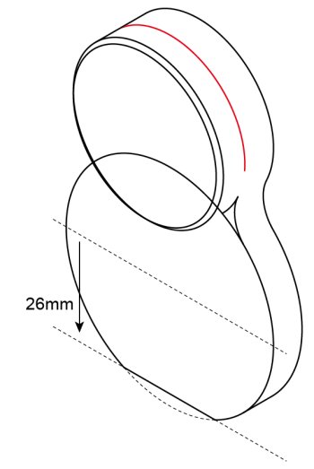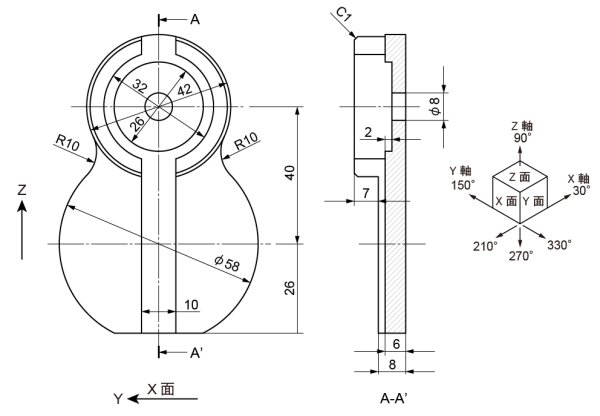 φ58な中心にY軸方向の中心線を引き、26mm下方へ移動して一番下の平面を作成します。稜線も加筆します。