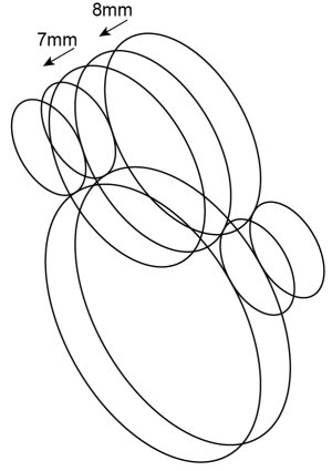 下図のように8mm、7mmづつ210°方向にコピーします。