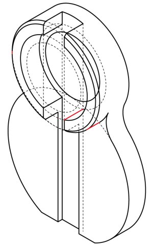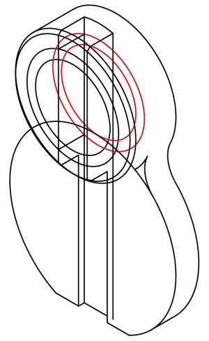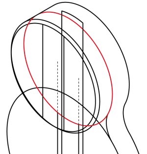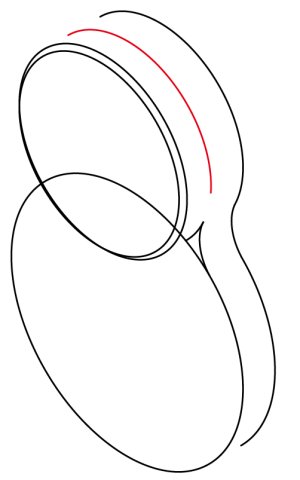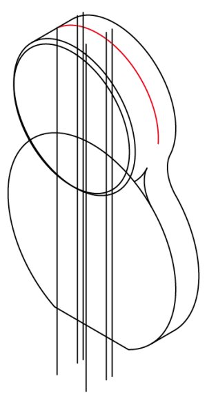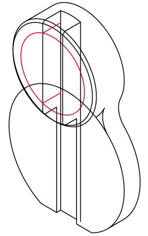 さらにこの2本を2mm/30°方向へコピーし、それに合わせて赤い楕円弧を2mm/30°方向へ移動させます。