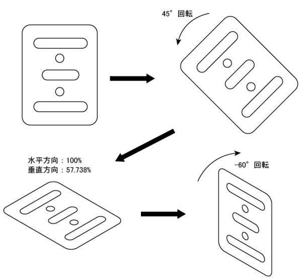 Z図の縮率は、X面、Y面とも同じで、それぞれの面は最後に回転させて合わせれば良い事になります。
