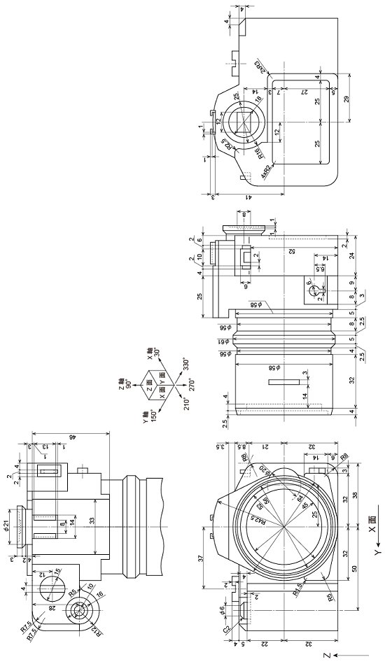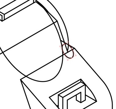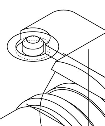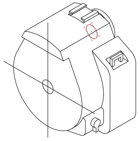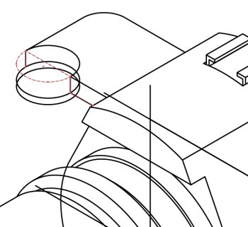 上の円柱状の部品位置は、奥の縦の中心線を37mm/150°にコピーし、上面の線との交点から12mm/210°に直線を引いて求めます。