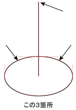 Aキー(ダイレクト選択ツール)で直線の上のアンカーポイントと楕円の上側の円弧の3つを、Shiftキーを押しながら選択します。