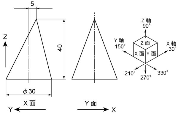 底面が直径30mmの円で、その中心から高さ40mmの所に頂点があるということです。