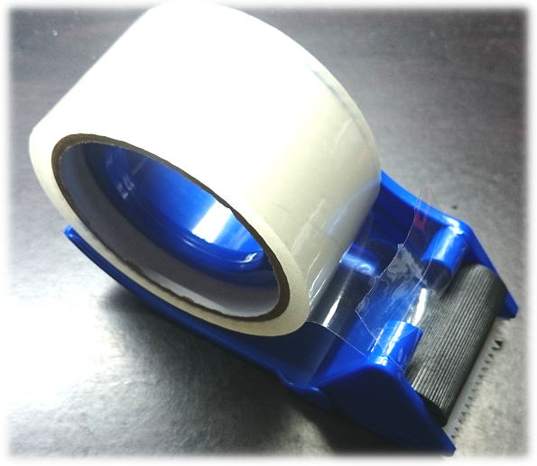 テープは幅広の透明な薄いテープで、青いのがテープカッター...ガムテープ大の物の使用が可能なサイズ。