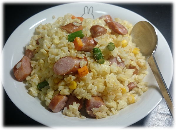 今回はウインナーを小さく切って、冷凍のスイートコーン少々、昨日夜の酒のつまみのスティックサラダの残りのニンジンを小さく切って、冷凍のアスパラガスも小さく切って、サラダ脂で炒める。